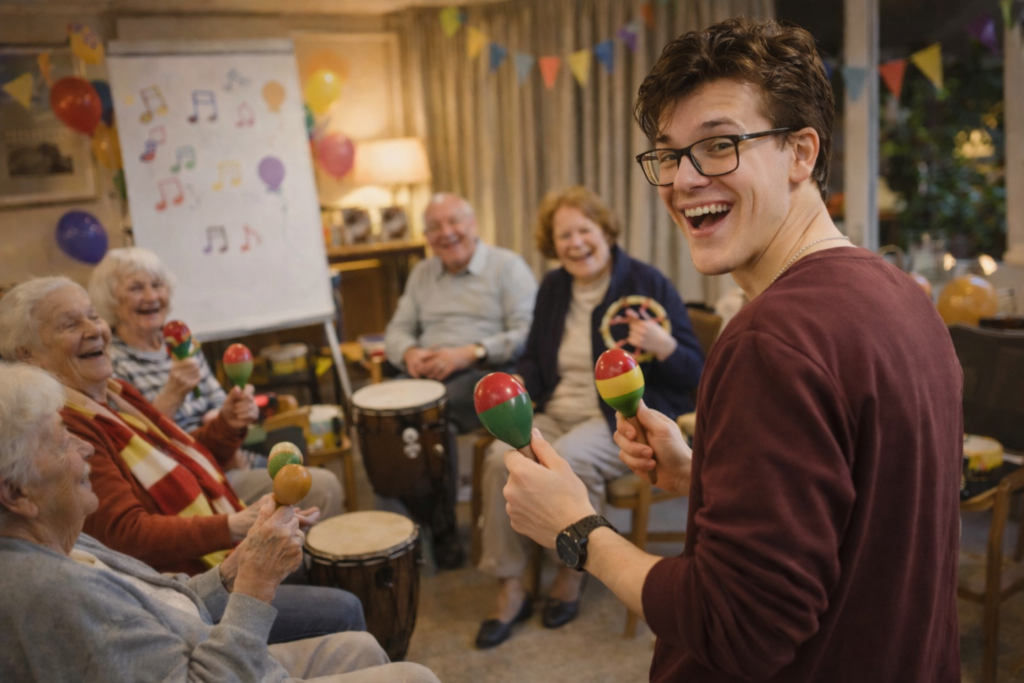 Actieve teambuilding met muziek: samenwerken, luisteren en timing. Iedereen kan meedoen.